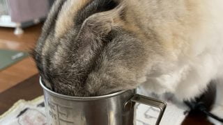水飲み場は2ヶ所あるのに、テーブルにグラスがあると気になってチェックしています。ちなみにビーカーの中身は水なので問題ないですが…どうしても飲みたいのですね。ホットコーヒーの湯気は毎回クンクンしてます。猫ちゃんもコーヒーの香りに癒されるんでし...