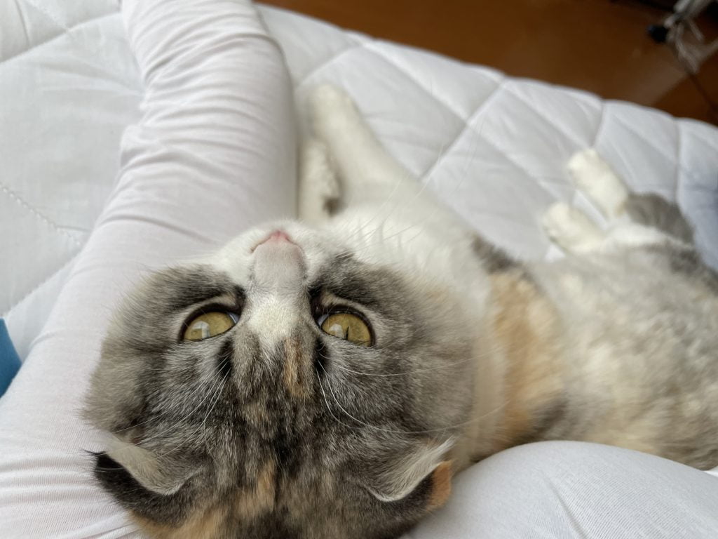 窓の外が気になる様子。ケージの上やキャットタワーの上から眺めています。このお陰で抱っこする時間が増えました。窓の外を抱っこして見せてあげます。しっぽをブンブン振って眺めています。ひたすら話しかける私です。朝晩のルーティーンになりました。