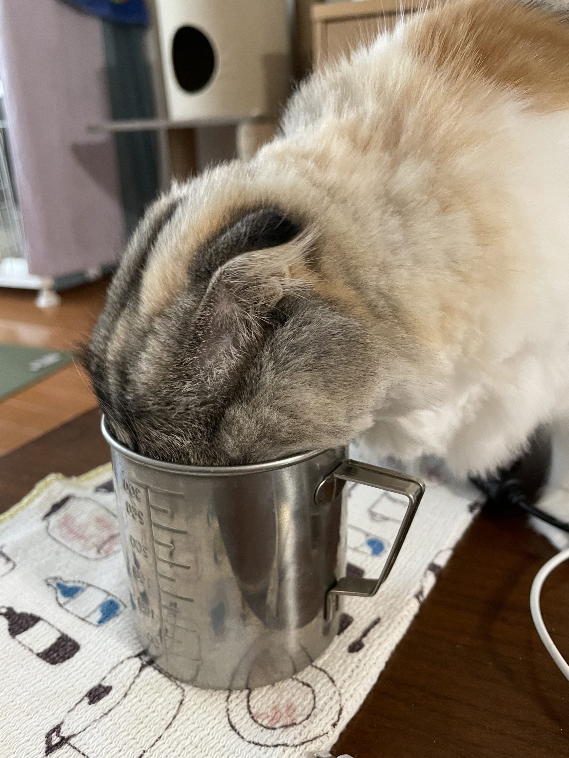 水飲み場は2ヶ所あるのに、テーブルにグラスがあると気になってチェックしています。ちなみにビーカーの中身は水なので問題ないですが…どうしても飲みたいのですね。ホットコーヒーの湯気は毎回クンクンしてます。猫ちゃんもコーヒーの香りに癒されるんでしょうか。今日もゆったりとした一日を過ごしたいです。